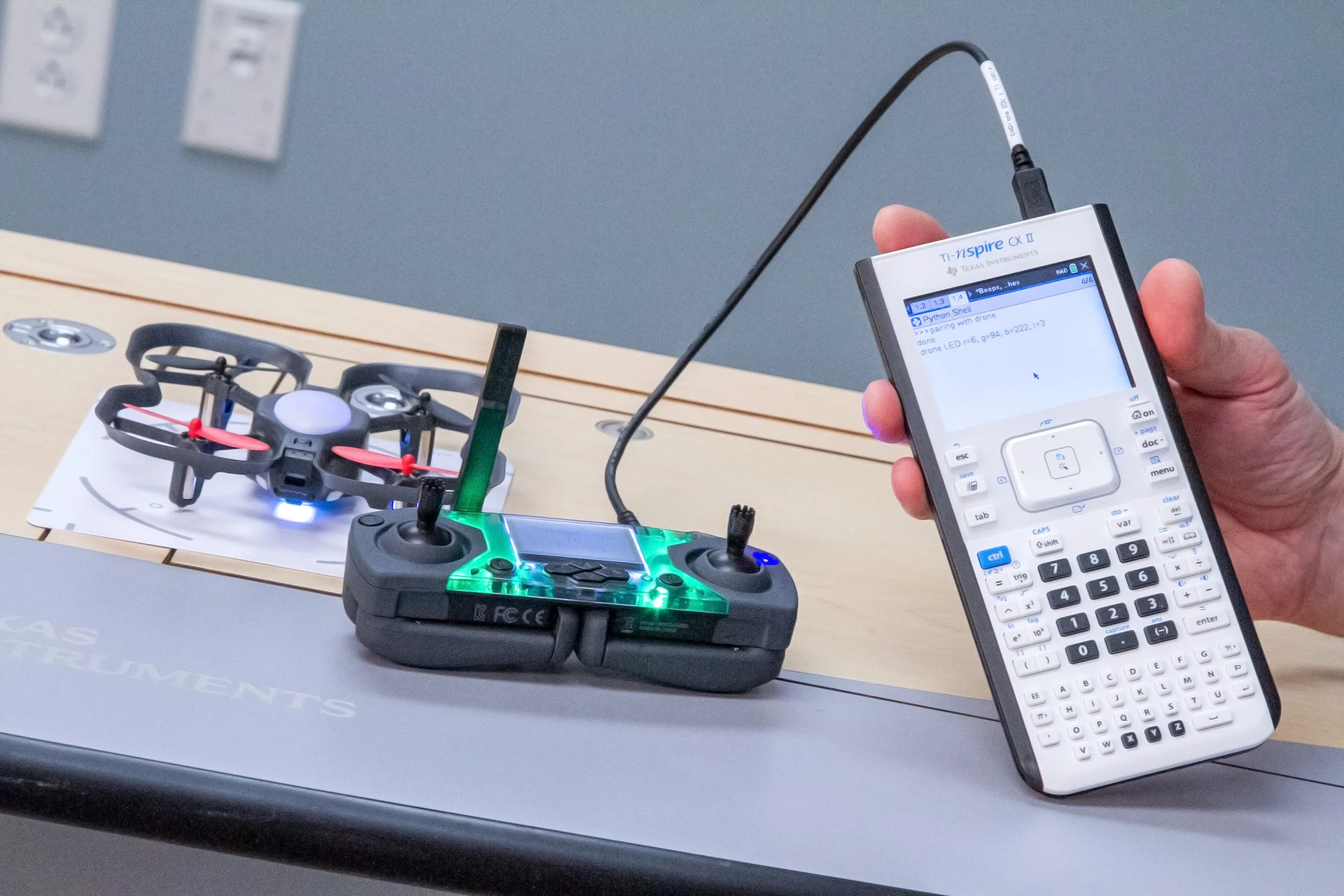 This custom USB cable is designed specifically for programming CoDrone EDU using the TI-Nspire CX II graphing calculator. It enables direct communication between the controller and calculator, so students can run Python programs and see their code take flight—no computer required. To get started, visit education.ti.com/codrone.